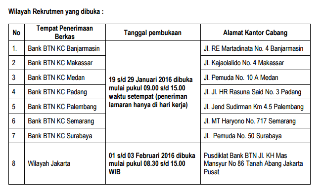 - Lowongan Kerja BANK BTN diterima paling lambat : 29 Januari 2016
