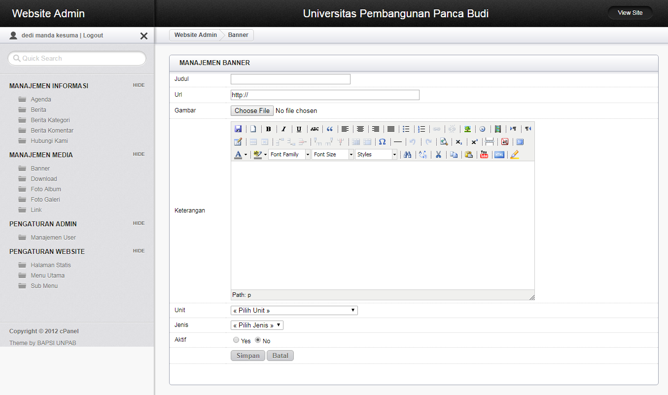 - Pilih Yes pada bagian Aktif agar banner muncul di website unit yang telah di pilih